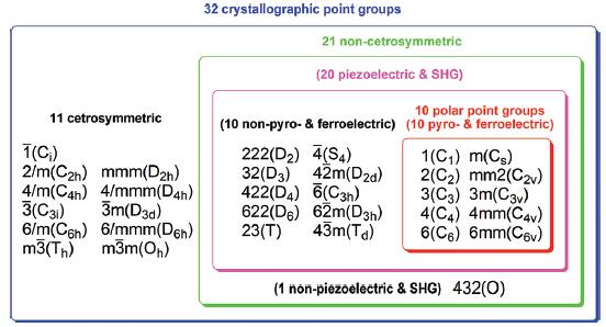根据定义,铁电化合物必须满足以下10个极性点群:C1,CS,C2,C2V,C3,C3V, C4,C4V,C6和C6V,如图1-1-1所示。