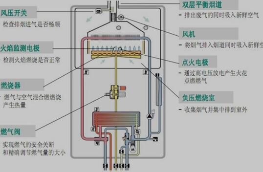 该壁挂式燃气锅炉可分为供热系统、生活热水系统、燃气燃烧系统、安全保护系统及控制系统五个部件。