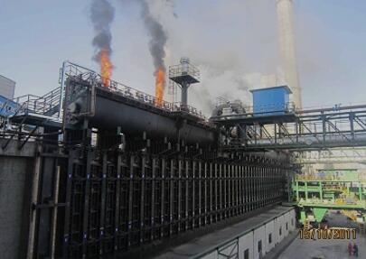 捣固炼焦可以提高机械强度和焦炭反应后强度,两个月的试生产表明,在配入30 %的弱黏结性煤时,焦炭的机械强度M40平均为90 % , M10为4 % ,热反应性CRI 为22 % ,反应后强度CSR 为65 %。收益是相同的,和炭化室高度450毫米顶装焦炉相比,捣固焦炉具有降低焦炭的数量,减少机械磨损,降低劳动强度,改善操作环境和减少排放的优点。装煤逸散烟尘采用炉顶消烟除尘车进行燃烧、洗涤除尘,完成无烟装煤操作,污染物的排放量减少了90%的负荷。出焦粉尘通过除尘拦焦车集尘罩进入地面除尘站,工艺除尘效率高,减少了环境污染。敲打刀边新型炉门,密封效果好,减少炉门荒煤气的逸散。